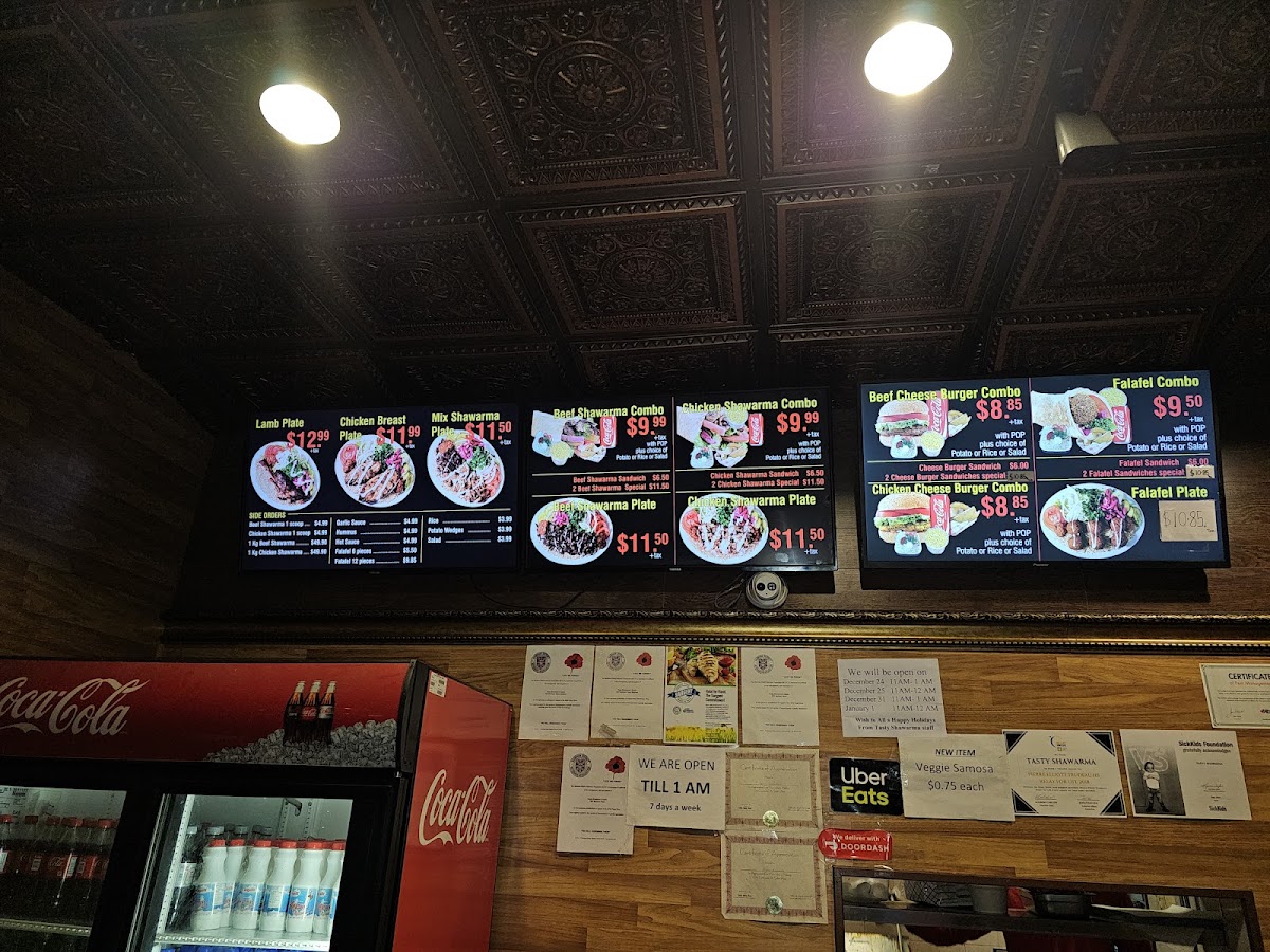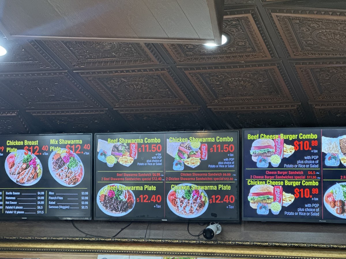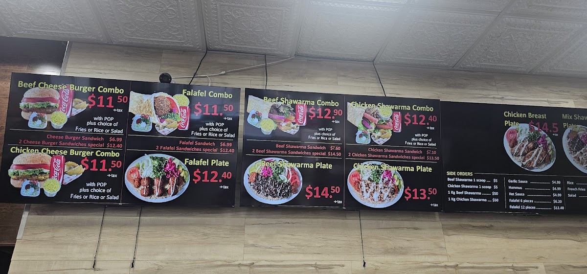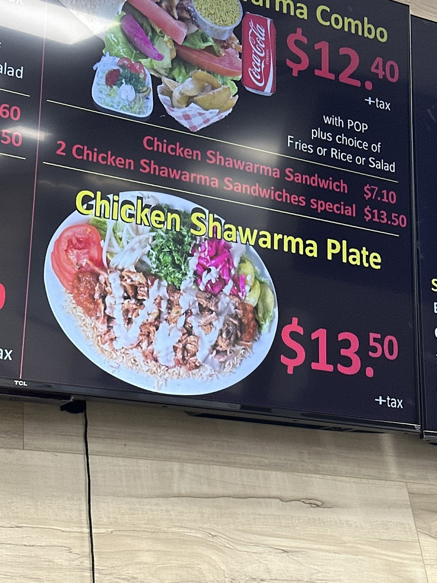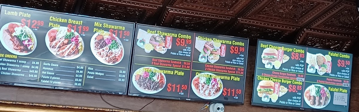 The menu at this Middle Eastern and Mediterranean restaurant features a variety of dishes centered around traditional shawarma and related offerings. Guests can choose from several sandwich options including chicken and beef shawarma sandwiches served in pita bread, as well as falafel sandwiches and cheeseburger sandwiches. For those seeking a more substantial meal, plates such as the Chicken Shawarma Plate, Falafel Plate, Mixed Shawarma Plate, and Lamb Shank are available.