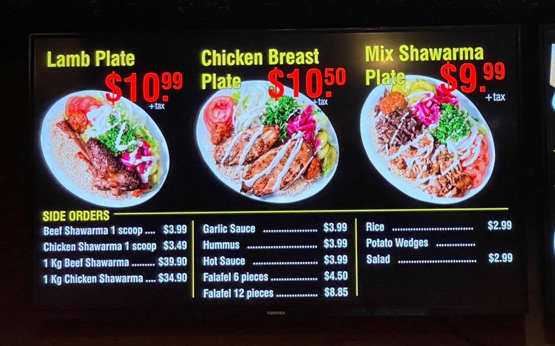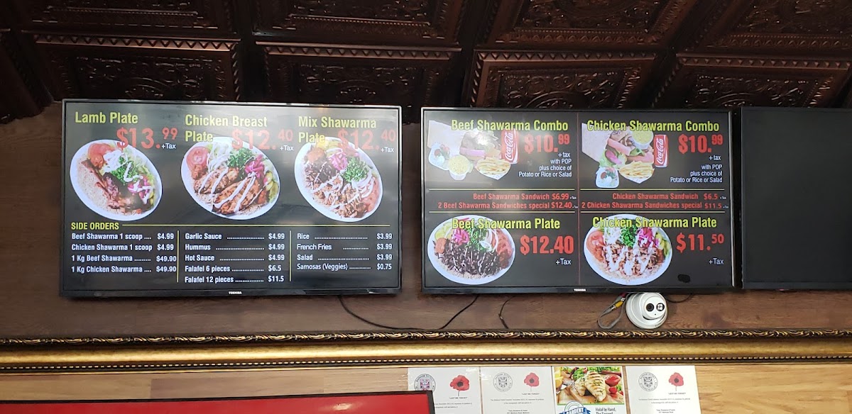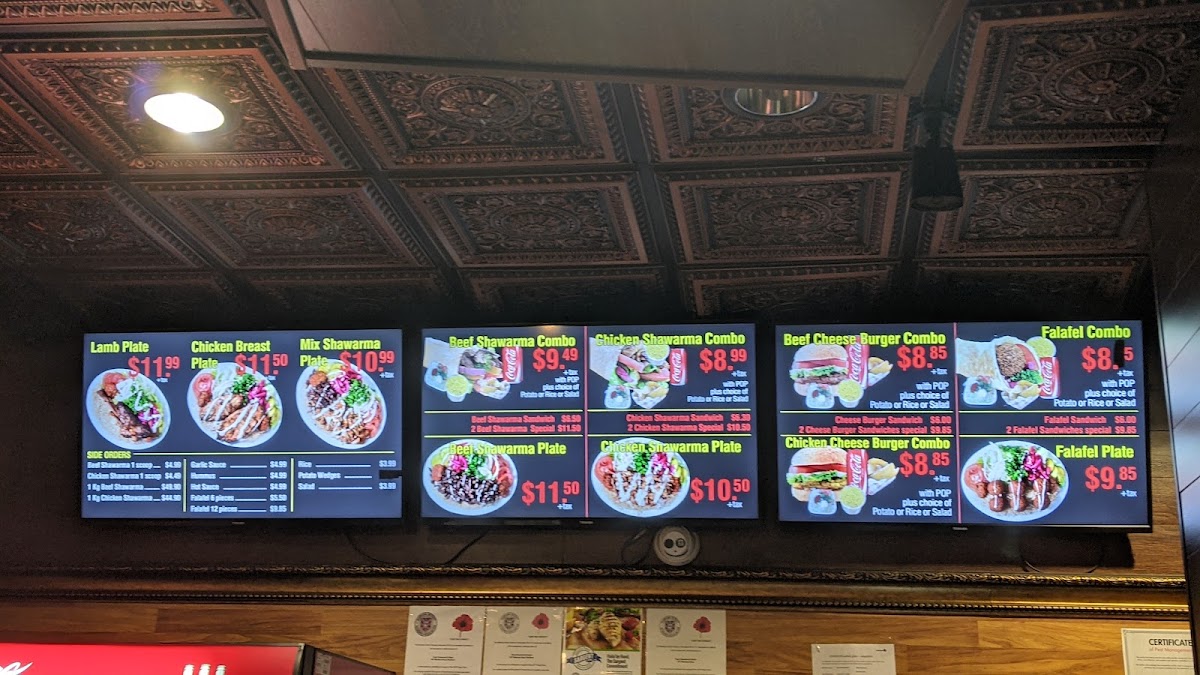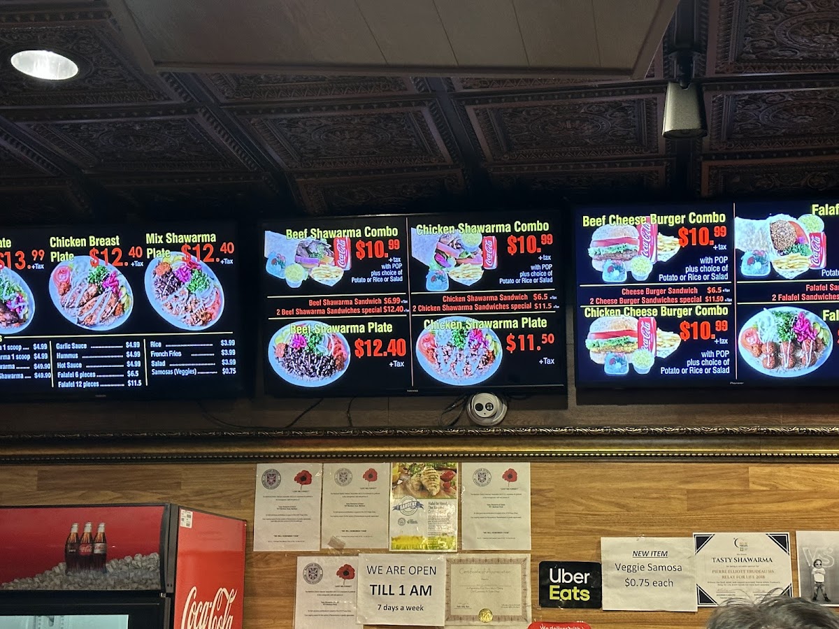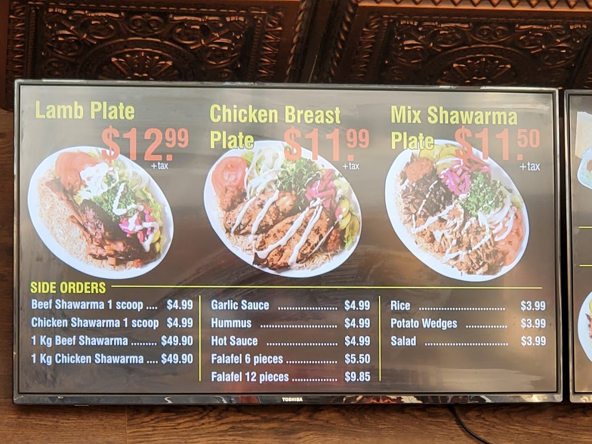 The menu at this Middle Eastern and Mediterranean restaurant features a variety of dishes centered around traditional shawarma and related offerings. Guests can choose from several sandwich options including chicken and beef shawarma sandwiches served in pita bread, as well as falafel sandwiches and cheeseburger sandwiches. For those seeking a more substantial meal, plates such as the Chicken Shawarma Plate, Falafel Plate, Mixed Shawarma Plate, and Lamb Shank are available.